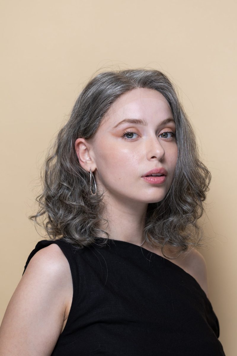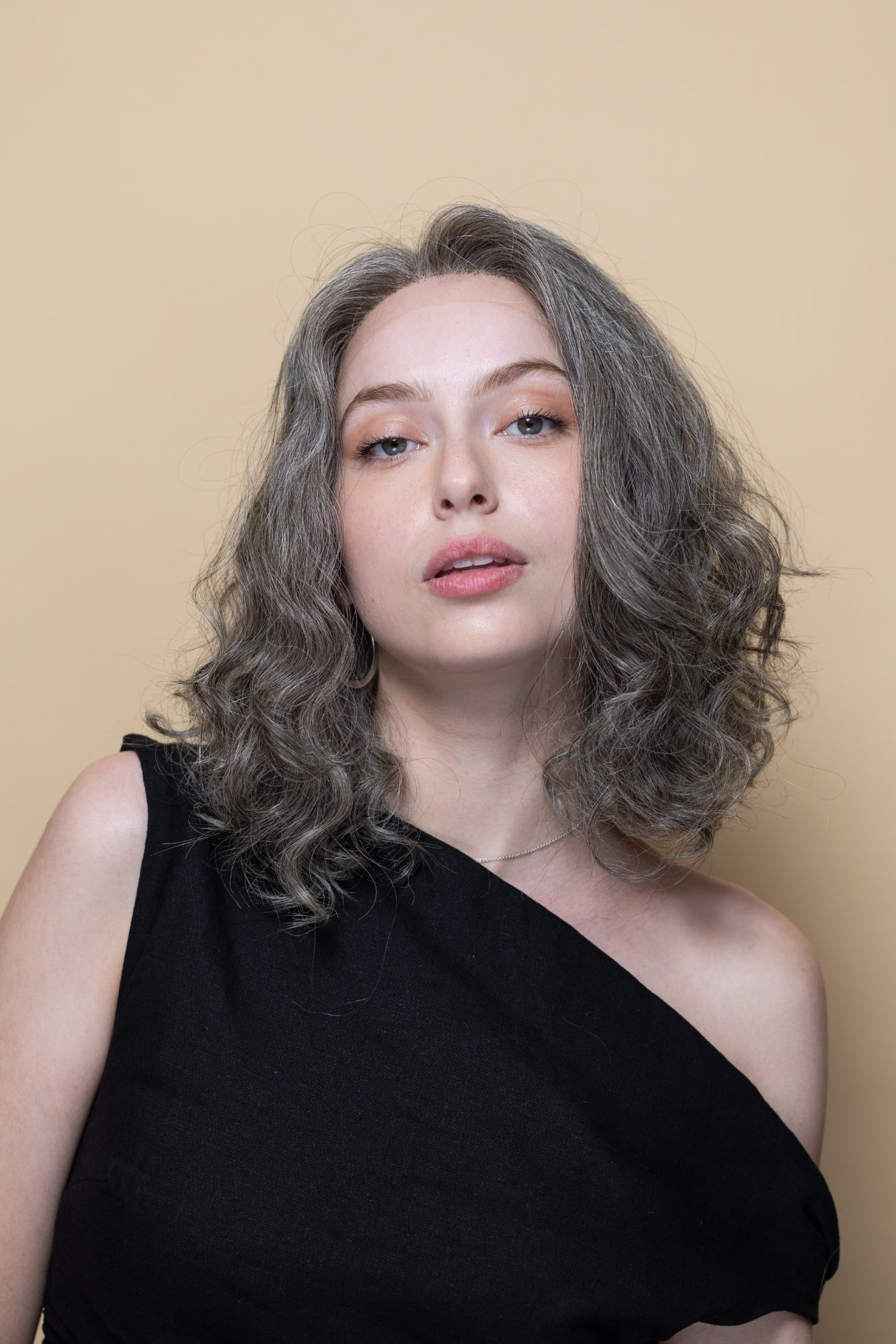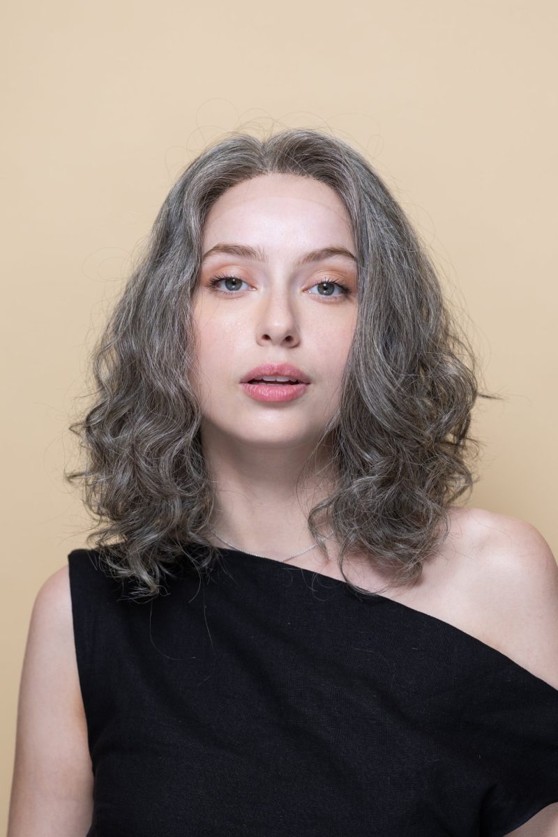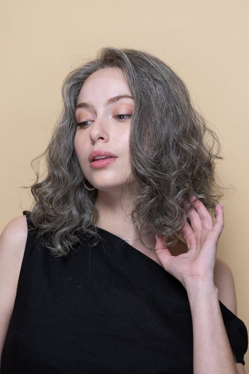 Fleur is a timeless beauty, with a shoulder-length curly wig in a stunning salt and pepper blend. Featuring a natural mix of silvery grey and deep charcoal tones, this wig offers a graceful look, full of character and charm