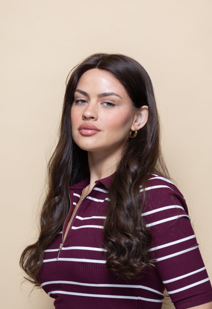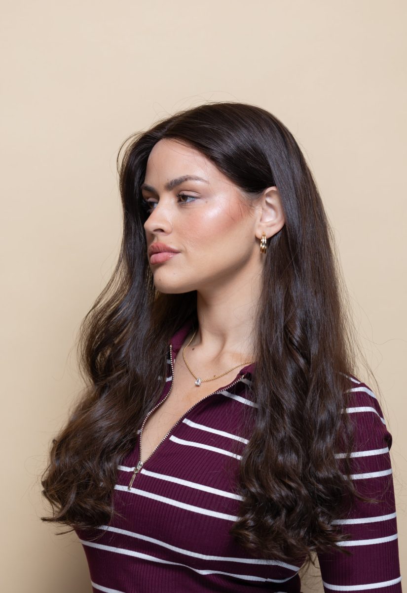 Mary is a long and elegant style with natural curls. The beauty of this wig is that it’s straight/silk on the top and has gorgeous waves and body on the bottom. This gives you a body without looking too thick. Gives you volume in all the right places. Wear it up, wear it down. You’re covered day to night. It’s a perfect base brown for some highlights or even balayage.